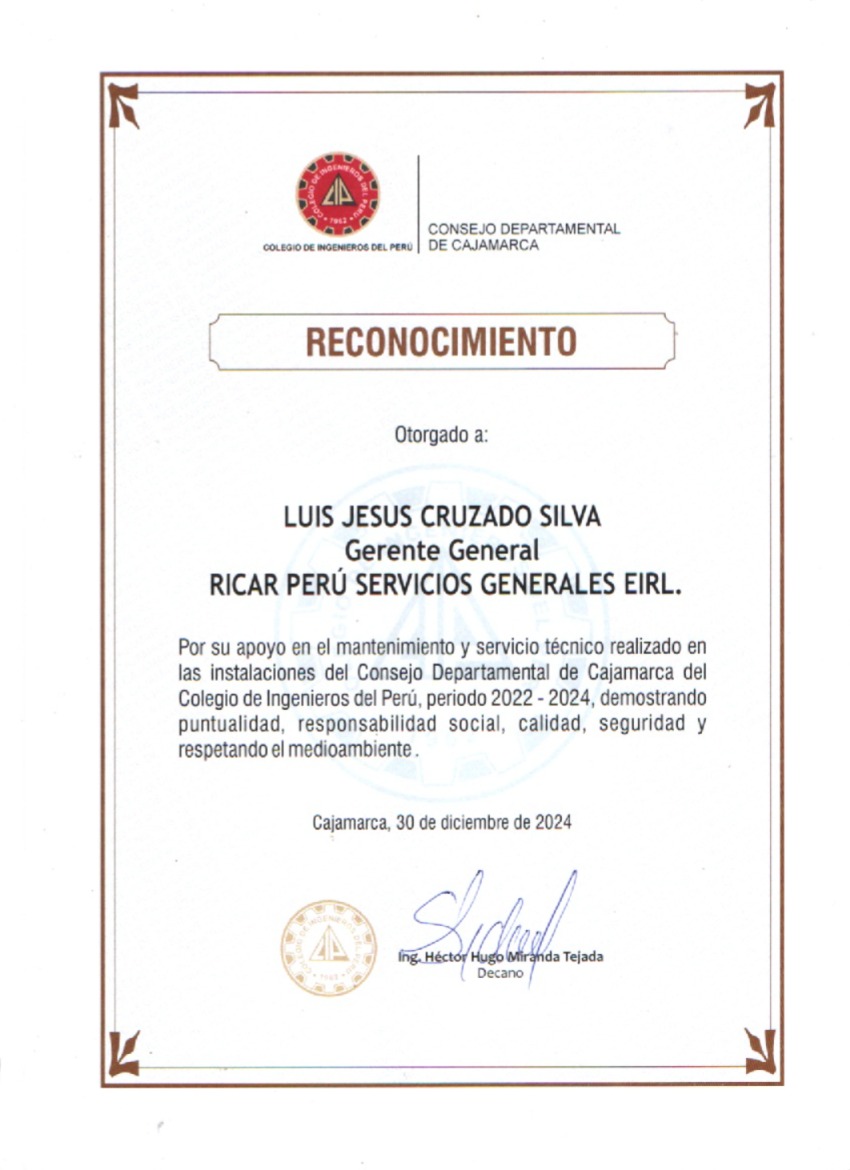 La empresa RICAR PERÚ SERVICIOS GENERALES E.I.R.L. fue constituida el 07 de julio del 2020, en la localidad de Cajamarca, teniendo como gerente general a (colocar nombre del gerente).